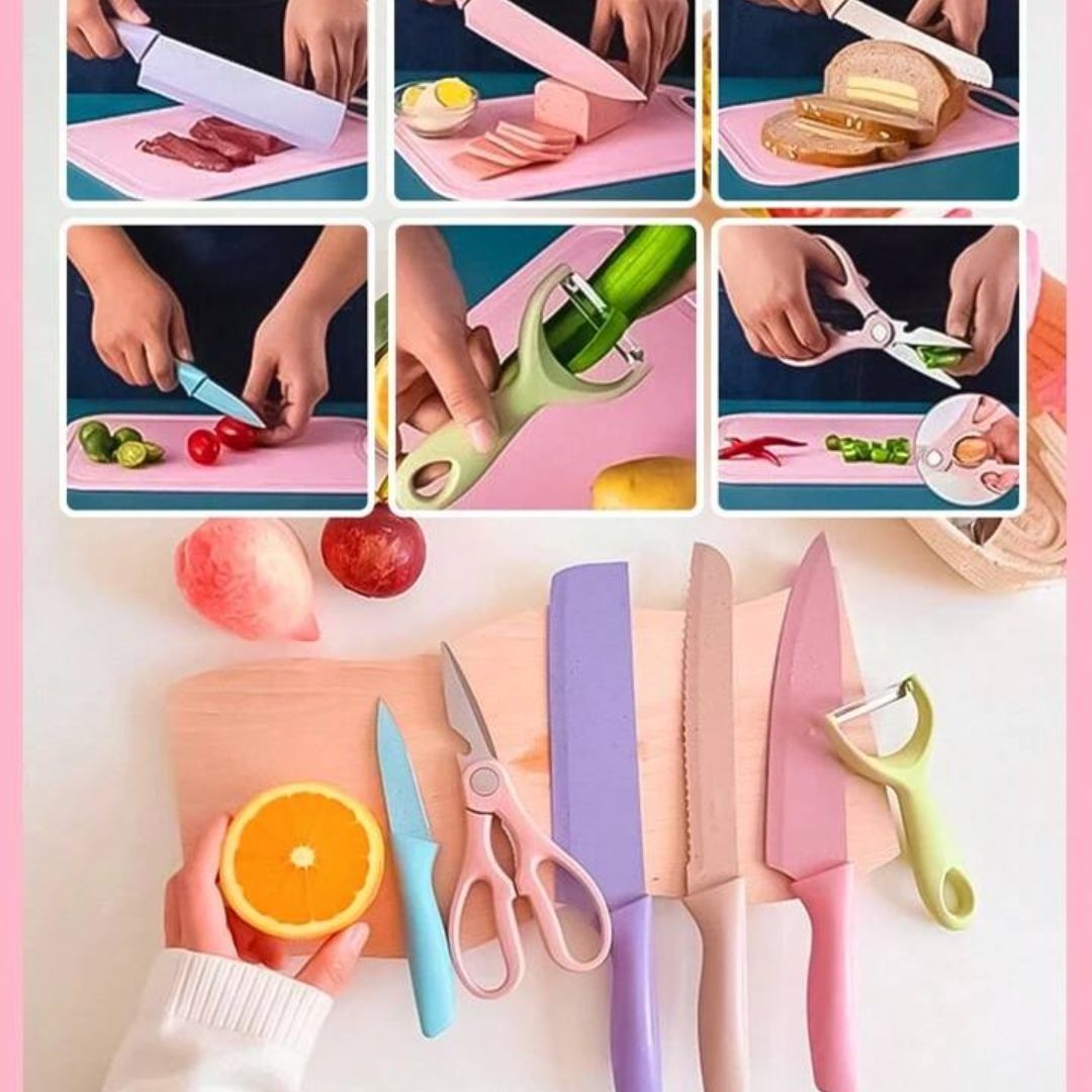✅Set completo de 6 piezas que incluye cuchillo chef, de pan, de cocina, tijeras multiusos, pelador cerámico y más.